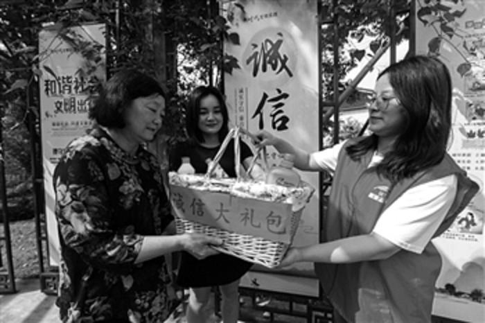 5月8日,浙江省长兴县画溪街道三新村的志愿者将“诚信大礼包”送给一季度诚信示范户。从2020年第一季度始,当地街道在下辖15个村(居)推行“诚信积分制”,通过评定村民参与环境卫生、志愿服务、无偿献血、移风易俗、好人好事等多项活动内容,形成村民“诚信积分”,进行相应奖励及警示,以此完善乡村诚信体系建设。