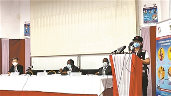 5月8日,在科特迪瓦阿比让,中国抗疫医疗专家组组长、天津市人民医院副院长刘筠(右一)向科政府介绍专家组交流考察总体情况。