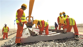 5月10日,在位于塔克拉玛干沙漠南缘的和(田)至若(羌)铁路若羌站施工现场,随着一组25米轨排缓缓落下,和若铁路正式进入铺轨阶段,这意味着新疆环塔里木铁路最后一段建设取得重大进展。