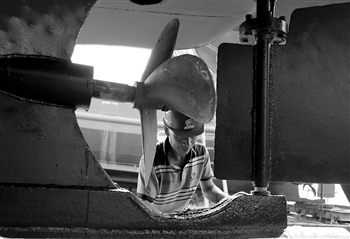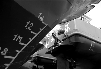 5月10日,在浙江玉环市栈台船只修造厂,工人正在给今年伏休第一批渔船上漆。进入东海伏休后,玉环渔民针对部分船体损坏、抗风浪能力减弱等情况,将船只送往船厂进行“体检”,确保船只下半年伏休期结束后,平安出海生产。 吴达夫 摄/人民图片