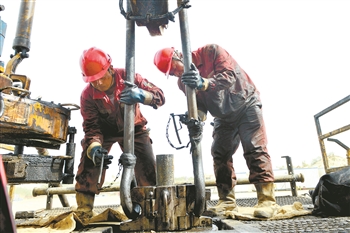5月1日,位于新疆库车市的中石化西北油田分公司采油三厂,职工们正坚守岗位,开展“百日攻坚创效”行动。图为工人正在起下管柱。 石立斌 摄