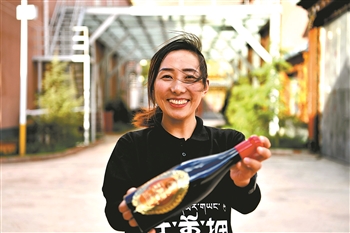 5月4日,西藏芒康县藏东珍宝酒业公司副总经理曲措在展示一款“达美拥”葡萄酒。
