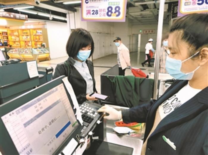 5月13日,长春消费者马雪使用手机里抢到的消费劵购物。本报记者 柳姗姗 摄