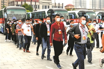 5月14日,湖北务工人员从湖北黄冈准备出发前往山东。