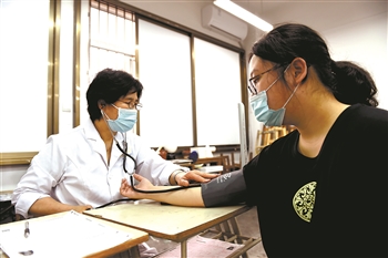 5月14日,在安徽省合肥市第二中学,合肥市第一人民医院体检中心的医务人员(左)为高三学生体检。该医院负责合肥市区四十五所中学共计三万余名考生的体检工作。