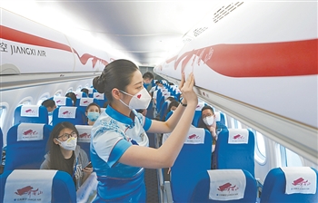 5月15日,空乘人员为乘坐“井冈山号”的旅客服务。