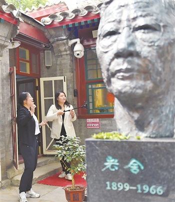5月16日,老舍纪念馆馆员何婷(左)与主播在直播。