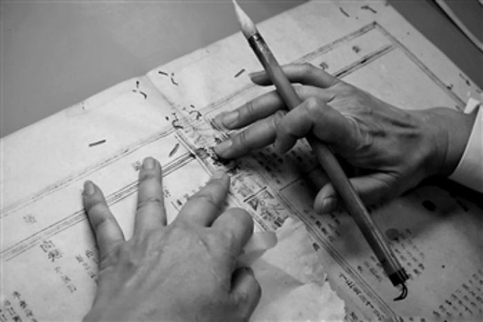 5月13日,天一阁藏品修复部主任王金玉在对书页进行修复。