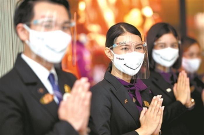 5月17日,泰国曼谷一家商场的工作人员在入口欢迎顾客。