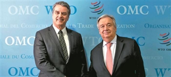 联合国秘书长安东尼奥·古特雷斯(右)和世界贸易组织总干事阿泽维多在日内瓦。(联合国网站)
