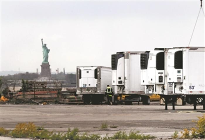 5月11日,冷藏车停放在美国纽约布鲁克林一处新开辟的临时停尸场所内。