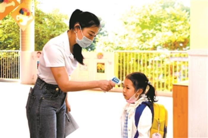 5月19日,龙竟成(左)在小朋友进入教室前为孩子测量体温。作为长沙市教育局幼儿园八方园中一班的班主任,疫情防控常态化时期,复学一周来,她严守规定保障防疫复学同时顺利进行。