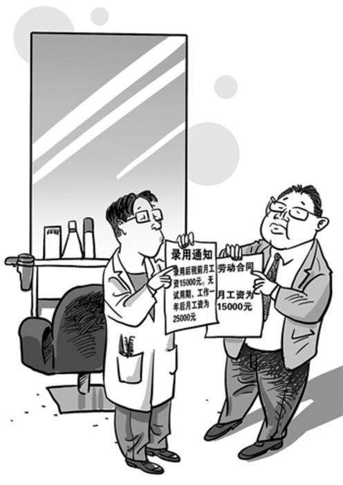 去年12月,一年期满,之后我的月工资仍然是15000元,发廊并没有按照约定给我调整工资。我翻出劳动合同才发现,上面写的约定月工资为15000元,无试用期,少了一条“工作一年后月工资为25000元”。