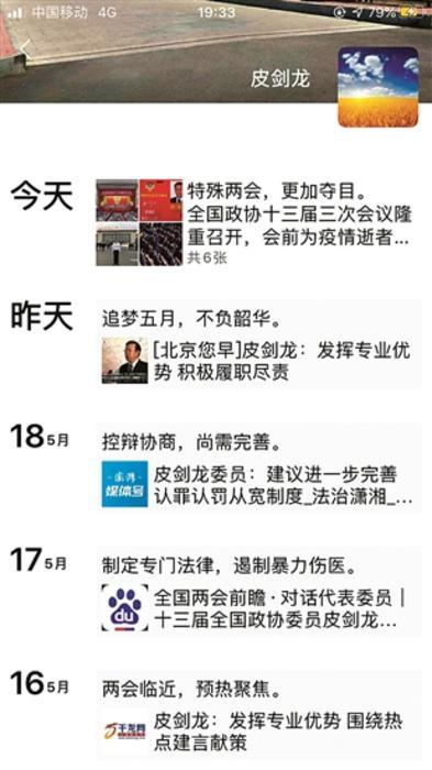 下图:5月21日,皮剑龙委员在微信朋友圈发了全国政协十三届三次会议在京开幕的相关照片。近日,他所转发的大多是媒体对他进行的会前采访。