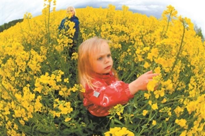 5月19日,在白俄罗斯首都明斯克郊区,一名小朋友在观赏油菜花。白俄罗斯近期天气转暖,各地种植的油菜已经大面积开花。新华社发(任科夫 摄)