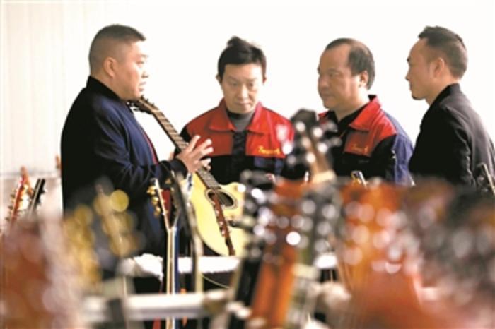 下图:2019年11月19日,郑传玖代表(左一)在吉他生产车间和工人们一起交流。 本报记者 杨登峰 摄