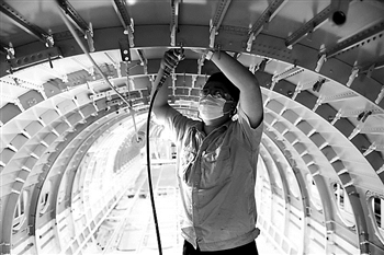 5月25日,沈阳,在中航沈飞民用飞机有限责任公司空客A220项目车间,工人在生产飞机。据了解,今年中航沈飞民用飞机有限责任公司承制的项目订单交付数量较去年同期增加。 视觉中国 供图