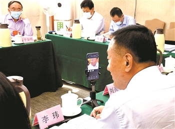 右图:5月23日,全国人大代表李玮在参加山东代表团分组审议政府工作报告时发言。通过代表面前的手机,有关部委工作人员连线旁听,听取意见建议。 新华社记者 吴雨 摄