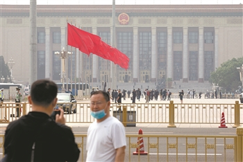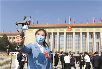 5月22日,第十三届全国人民代表大会第三次会议在北京人民大会堂开幕。一位代表在北京人民大会堂前。 陈斌 摄