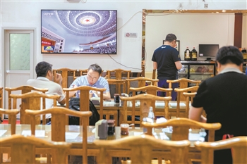 5月25日晚,北京一家餐馆内,电视上正在播放有关全国两会的新闻。