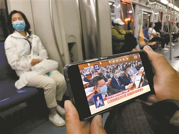 5月21日下午,北京地铁二号线,一名乘客用手机观看全国政协十三届三次会议开幕会直播。