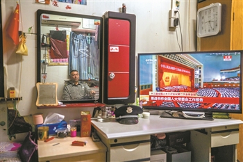5月25日,北京一宿舍内,两名轮休的保安正在收看全国两会直播节目。