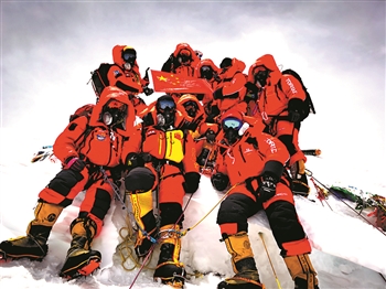 图为2020珠峰高程测量登山队在峰顶合影留念。