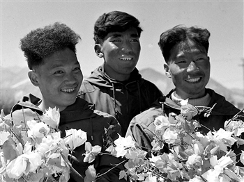 图为1960年6月7日,人类历史上首次从北坡登顶珠峰的中国登山队队员王富洲(右)、贡布(中)与屈银华三人凯旋拉萨后捧花合影。 新华社发