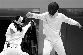 5月23日,辽宁省击剑队队员杨丰名(右)在训练中。当日,辽宁省击剑队进行公开训练。辽宁省击剑队在做好疫情防控工作的同时,结合队内实际情况,让队员通过训练强化体能、精练技术、磨炼意志。 新华社记者 潘昱龙 摄