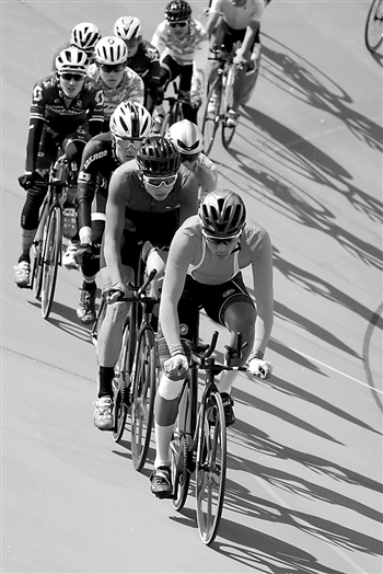 5月25日,河北省男子场地自行车队队员王鑫(前)和队友在训练中。