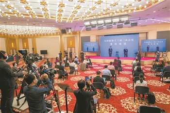 5月21日,在全国政协十三届三次会议首场“委员通道”上,来自医药卫生界的全国政协委员通过屏幕接受媒体采访。 本报记者 王伟伟 摄