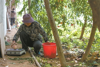 5月26日上午,平谷区中胡家务村的一位农户在为桃子称重,每个桃的重量不能小于4两,这些桃子将直供北京华联超市。