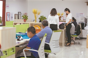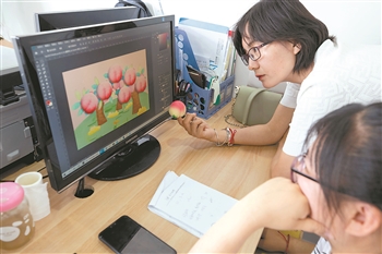 5月22日上午,北京市平谷区锐E空间产业园,岳巧云正和员工讨论桃子的包装盒设计。
