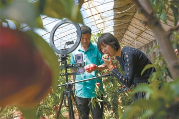 5月23日,北京市平谷区刘立成家的大棚里,岳巧云(右一)正在直播卖桃。为了让大家更直观感受到桃子的品质,她摘下桃子为大家试吃。一旁的刘立成,拿着自家桃子在镜头前展示。