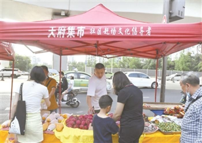 5月29日,成都市民在黉门街的一处临时占道摊点选购水果。