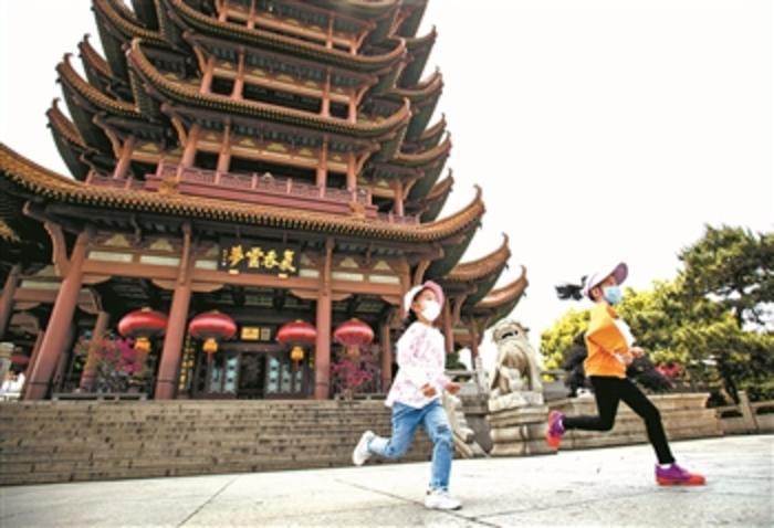 图为武汉黄鹤楼,儿童在重新开放的黄鹤楼景区奔跑(4月29日摄)。