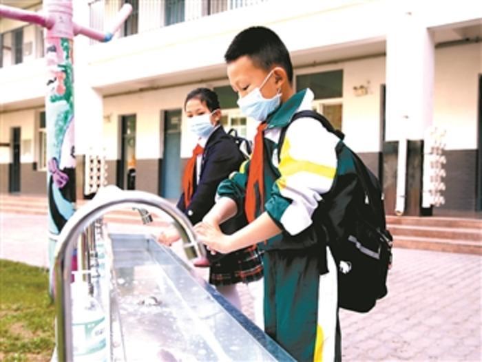 5月31日,银川市兴庆区回民第二小学学生在进入教室前洗手。