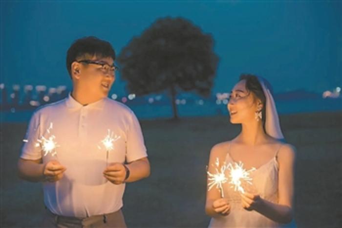 图为付鉴和李海婷在夜幕下拍摄婚纱照。
