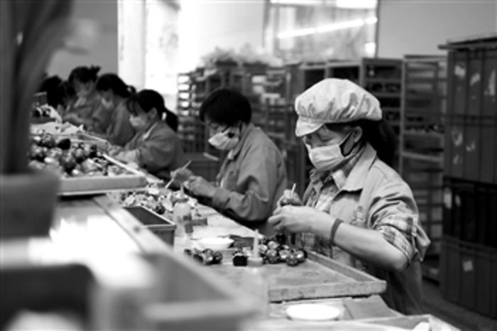 5月27日,工人在张家界占生塑胶制品有限公司厂房内生产玩具。