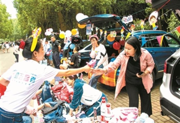 5月31日,首届东山后备箱商品集市在南京市江宁区的东山香樟园开幕。40位摊主带着他们的日用百货、服装、玩具、文具、食品、花卉、化妆品、装饰品、母婴用品等商品前来摆摊销售。谷昌旺 摄/人民图片