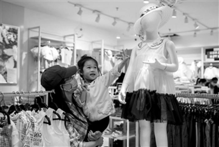 5月31日,呼和浩特,家长带着孩子在玉泉区七彩城购物中心选购儿童用品。丁根厚 摄/视觉中国