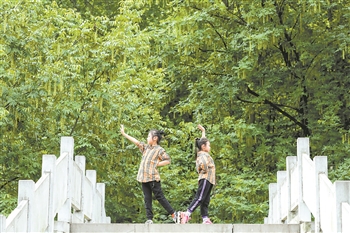 5月31日,朱皓嫡(右)与陈熙妍在公园的石桥上跳起舞来。新华社记者 欧东衢 摄