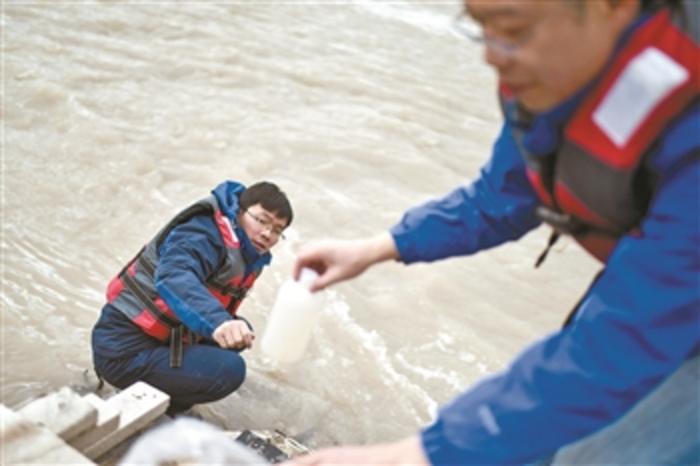 图为2019年8月8日,长江科学院科考队员刘敏(左)与赵良元在位于长江源园区的聂恰曲采集水样。