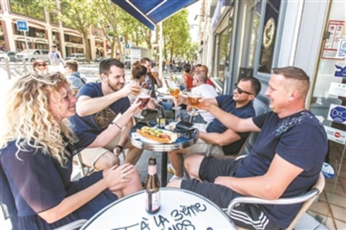 6月2日,在法国北部城市里尔,人们在一家餐馆的露天区用餐。法国6月2日起进入解禁第二阶段,自2日起,餐馆、酒吧等可重新开门营业,但位于“橙色区域”的餐馆和酒吧仅可开放室外座位,禁止在室内用餐。新华社发 (塞巴斯蒂安·库尔吉 摄)