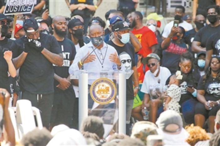 6月2日,在美国休斯敦,休斯敦非裔市长希尔维斯特·特纳(中)在纪念游行上讲话。 新华社发 (劳承跃 摄)