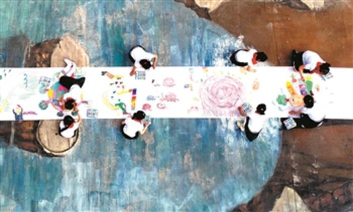 6月4日,在江苏省海安市523文化产业园,海安市南屏小学的学生进行环保主题绘画(无人机照片)。