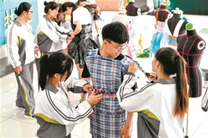当日,长兴职教中心服装专业、学前教育专业的学生利用专业特长,将报纸、台布、编织袋等低碳环保和可循环废旧材料设计、制作成环保服装和环保手工作品进行职业展示,倡导绿色低碳生活和环境保护理念。谭云俸 摄/人民图片