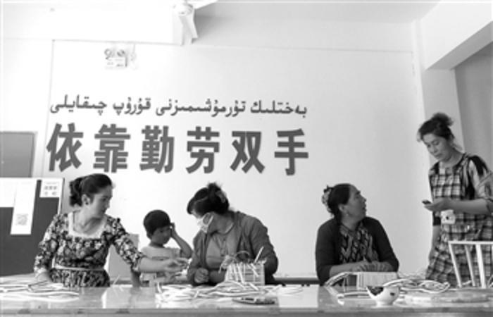 6月3日,扶贫工厂的妇女们正在编织手工筐。南疆克州阿湖乡阿热买里村是新疆区总定点扶贫村,人口众多,有村民4600多人,贫困发生率一度达到65.29%,经过区总驻村工作队的努力,2019年年底成功脱贫。