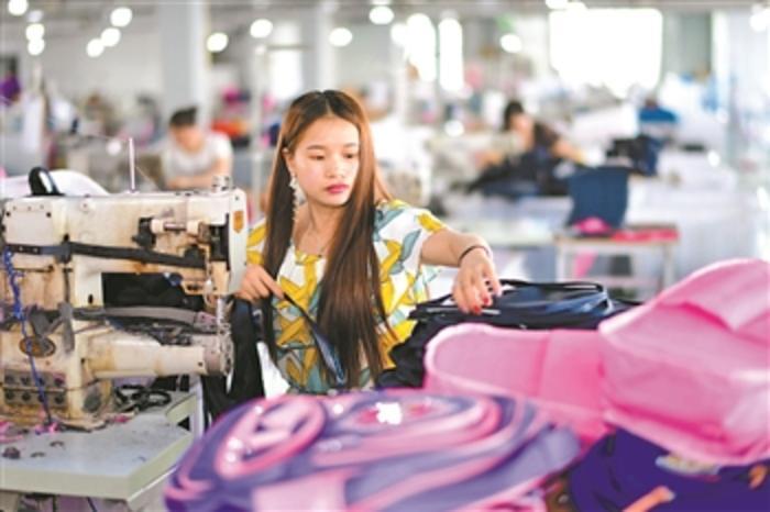 6月6日,工作人员在贵州大龙经济开发区一家箱包生产企业加工书包。