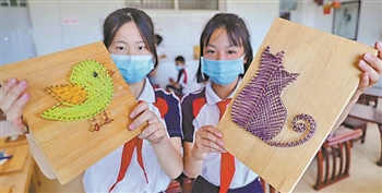 时值“世界环境日”,河北秦皇岛海港区东港镇第二小学同学们巧手制作钉子画。曹建雄 摄/视觉中国